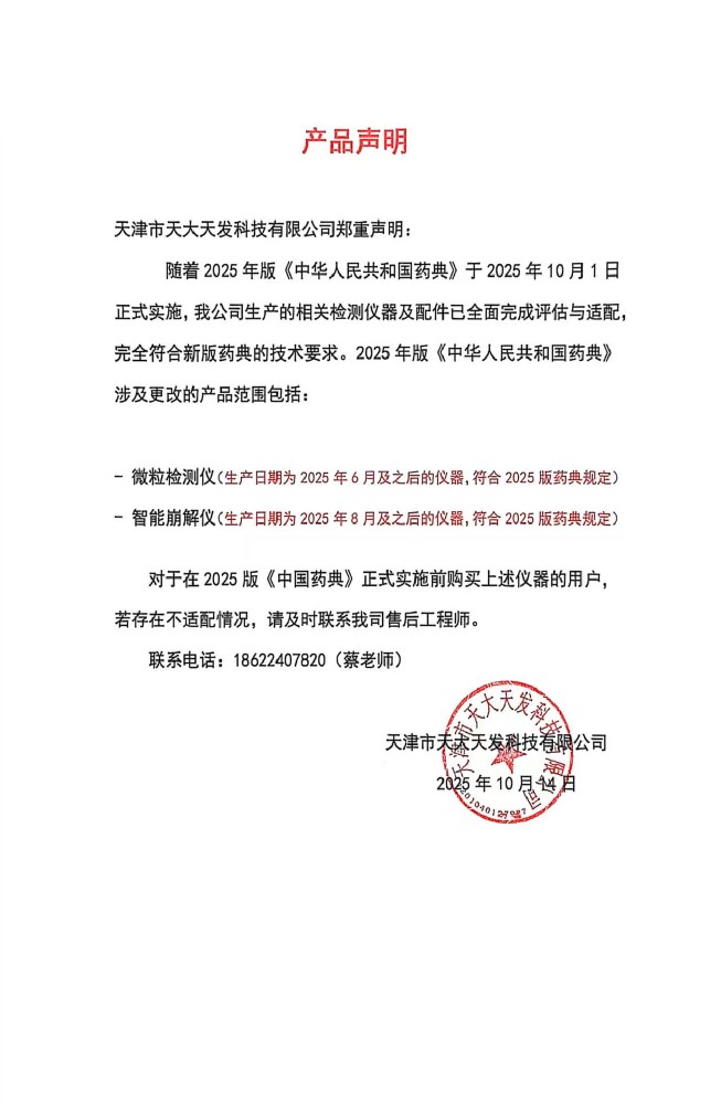 歡迎您進入天津市天大天發科技有限公司的網站進行瀏覽,首先感謝各界朋友多年來對天大天發藥品檢測儀器和分析儀器的關心與支持!